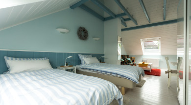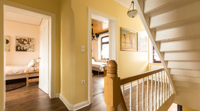Mehr zum ErdgeschossIm Obergeschoss angekommen erwartet Sie hier neben dem wunderschönen, großen Bad zwei Gästezimmer. Eins zur Alleinnutzung (alle Gruppen mit einem Schnarcher werden sicher begeistert sein) und eins mit zwei getrennten Betten, die wir Ihnen auf Wunsch gern zu einem Doppelbett zusammenschieben. Vom Badezimmer und dem zum Garten gelegenen Einzelzimmer haben Sie einen tollen Blick über die rheinische Tiefebene.