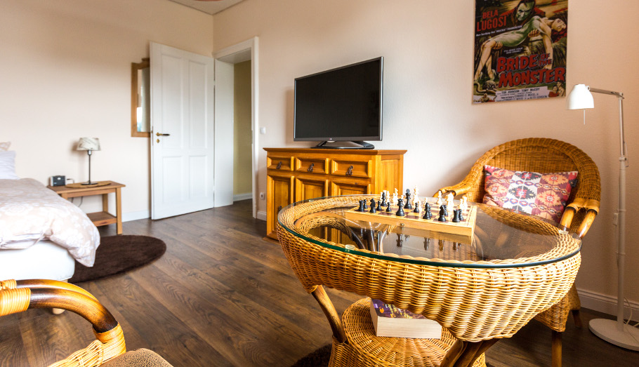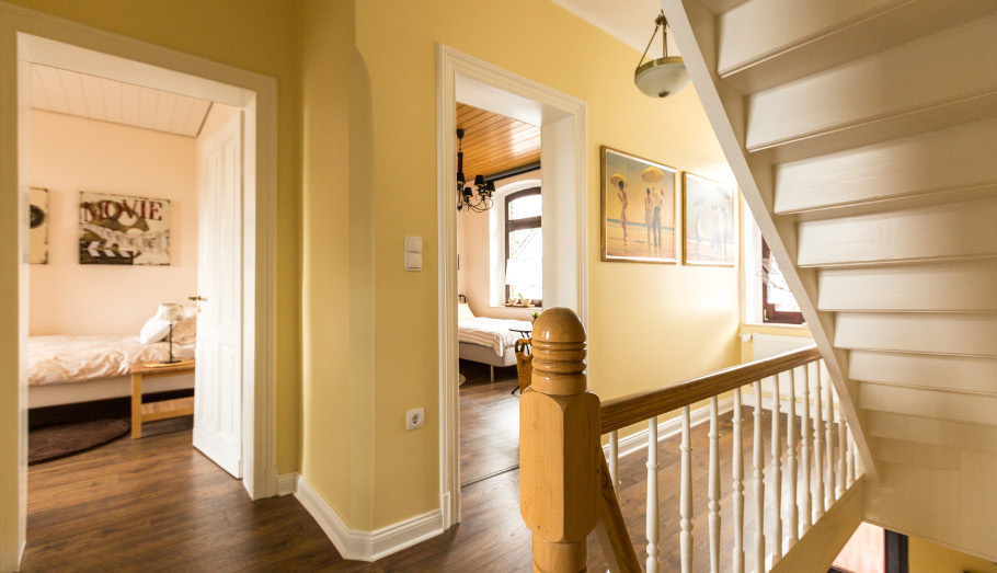 Im Obergeschoss angekommen erwarten Sie hier neben dem wunderschönen, großen Bad zwei Schlafzimmer. Eins zur Alleinnutzung (alle Gruppen mit einem Schnarcher werden sicher begeistert sein) und eins mit zwei getrennten Betten, die wir Ihnen auf Wunsch gern zu einem Doppelbett zusammenschieben. Jedes Zimmer verfügt über einen internetfähigen Fernseher und natürlich über guten WLAN-Empfang. Von dem zum Garten gelegenen Einzelzimmer haben Sie außerdem einen tollen kilometerweiten Blick über die rheinische Tiefebene.